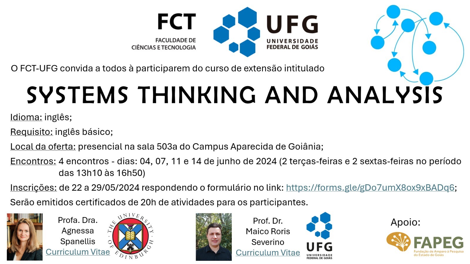 A Faculdade de Ciências e Tecnologia da UFG (FCT-UFG) convida o público da universidade para participar do curso de extensão intitulado "SYSTEMS THINKING AND ANALYSIS". Este curso será ministrado pela Profª Drª Agnessa Spanellis (University of Edinburgh/Escócia) e terá o intuito de ajudar o público com a análise de problemas de pesquisa.
