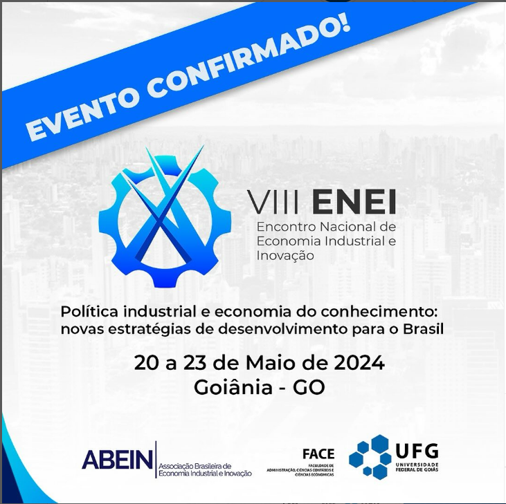O VIII Encontro Nacional de Economia Industrial e da Inovação (ENEI) é um evento contínuo, promovido anualmente pela Associação Brasileira de Economia Industrial e Inovação (ABEIN). Em sua oitava edição, se realizará na Faculdade de Administração, Ciências Contábeis e Ciências Econômicas (FACE/UFG), tendo como temática “Política industrial e economia do conhecimento: novas estratégias de desenvolvimento para o Brasil” e será realizado entre os dias 20 e 23 de maio de 2024